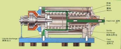 卧式螺旋卸料沉降离心机主要由高转速的转鼓、与转鼓转向相同且转速比转鼓略高或略低的螺旋和差速器等部件组成。当要分离的悬浮液进入离心机转鼓后,高速旋转的转鼓产生强大的离心力把液相密度大的固相颗粒沉降到转鼓内壁,由于螺旋和转鼓的转速不同,而这存在有相对运动(即转速差),利用螺旋和转鼓的相对运动把沉积在转鼓内壁的固相推向转鼓小端出口处排出,分离后的清夜从离心机另一端排出。差速器(齿轮箱)的作用是使转鼓和螺旋之间形成一定的转速差。