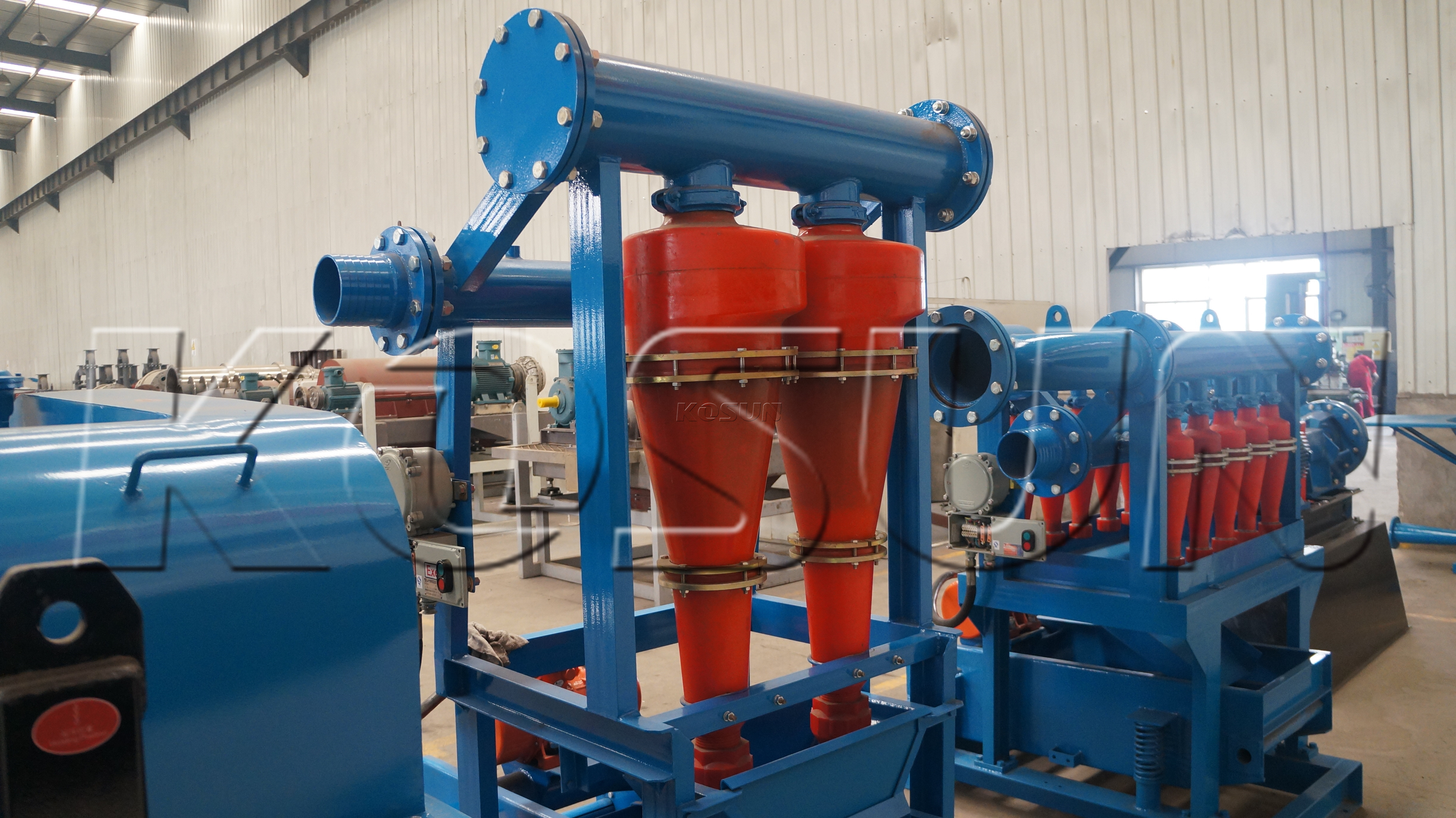 除砂器是处理钻井液的二级固控设备,旋流器的直径大小不同,常用的是10″和12″旋流器,主要用于分离钻井液中粒度为45-75μm的固相颗粒。可根据客户要求处理量的大小,选择几组旋流器组合成泥浆除砂器,利用离心沉降工作原理,悬浮颗粒受到离心加速度的作用后可从液体中分离出来。