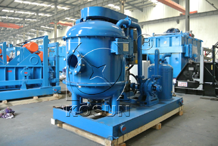 钻井液真空除气器是在固控设备中主要用于去除有害气体,由真空泵、汽水分离器、罐体、电机和防爆电柜组成。钻井液真空除气器利用真空泵的抽吸使泥浆进入真空罐内,使得钻井液和罐体内产生压力差,气体上升通过真空泵抽到汽水分离器中,在汽水分离器中,有毒的气体硫化氢会溶于水,其余的气体通过汽水分离器出口排出。