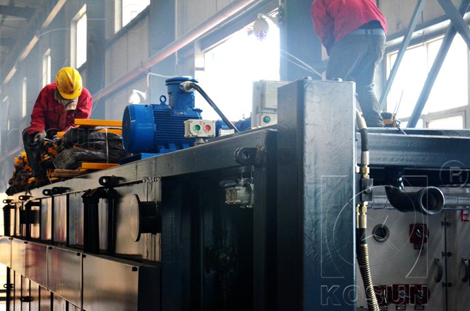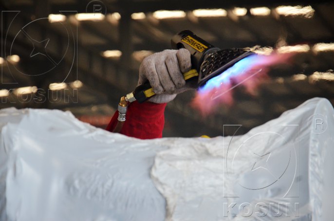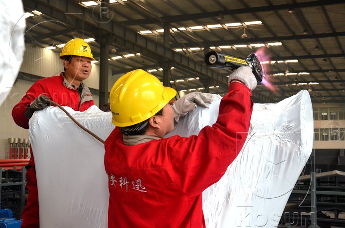 为了防止机器在运输途中受潮,工人将塑料纸牢牢地套在机器上面。